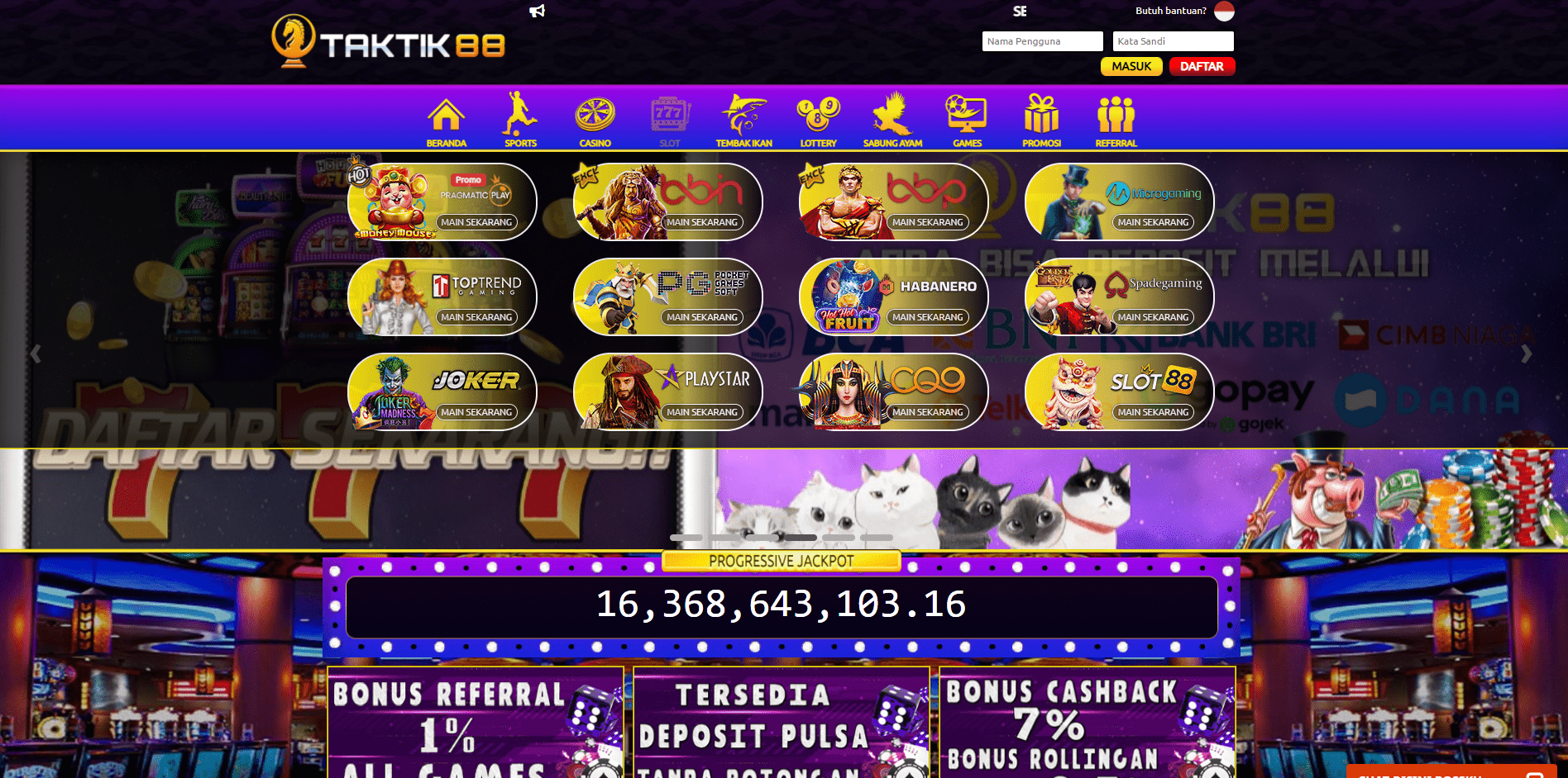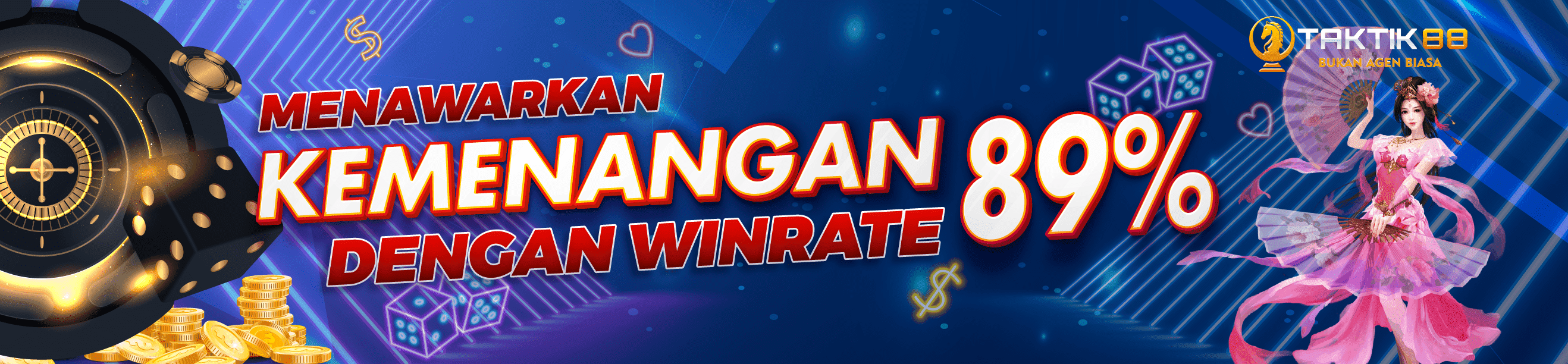 Selamat datang di Taktik88! Sebagai salah satu situs bet slot gacor hari ini yang terpercaya, kami berkomitmen untuk memberikan anda sensasi bermain game bet slot online dengan tingkat kemenangan yang lebih tinggi. Dalam perjalanan mencari situs terbaik, mungkin ada di antara kalian yang kesulitan menemukan situs slot uang asli yang terpercaya dan yang memberikan peluang jackpot lebih besar. Nah, di sinilah kami hadir! Dengan bangga, kami memperkenalkan diri sebagai agen slot online terbaik yang bisa anda akses kapan saja, 24 jam sehari melalui smartphone anda. Tak hanya itu, anda juga dapat menikmati berbagai jenis permainan bet online lain seperti Poker Online, Live Casino, Togel Online, dan Bet Bola dengan hanya satu akun.