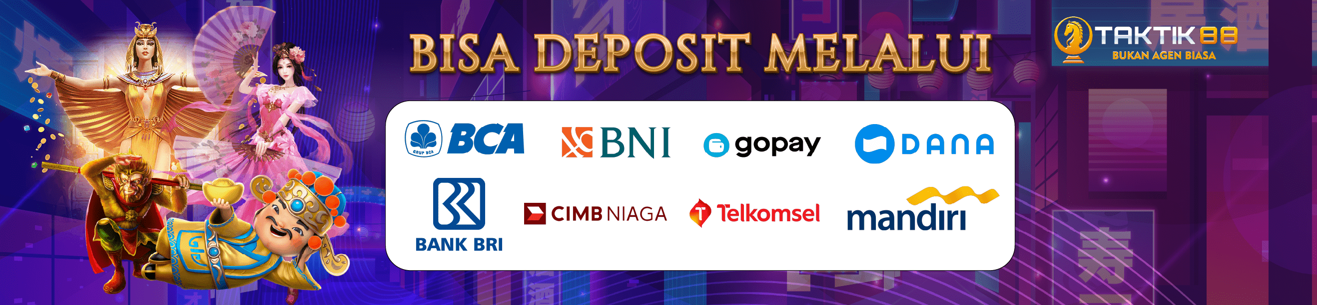 Dan kabar baiknya adalah, Taktik88 tidak hanya berhenti di sini. Kami juga menghadirkan berbagai opsi transaksi untuk memudahkan anda. Jadi, buat kamu yang mencari fleksibilitas dalam bertransaksi, kami memiliki solusinya. Mulai dari metode perbankan online seperti BCA, BNI, BRI, Mandiri, dan CIMB, hingga E-wallet seperti DANA & GOPAY. Bahkan, kami juga menyediakan QRIS untuk transaksi super cepat dan layanan deposit via pulsa Telkomsel. Dengan segala kemudahan ini, sudah saatnya anda bergabung dan memilih Taktik88 sebagai situs favorit untuk game slot gacor pilihan anda. Selamat bergabung dan semoga beruntung!